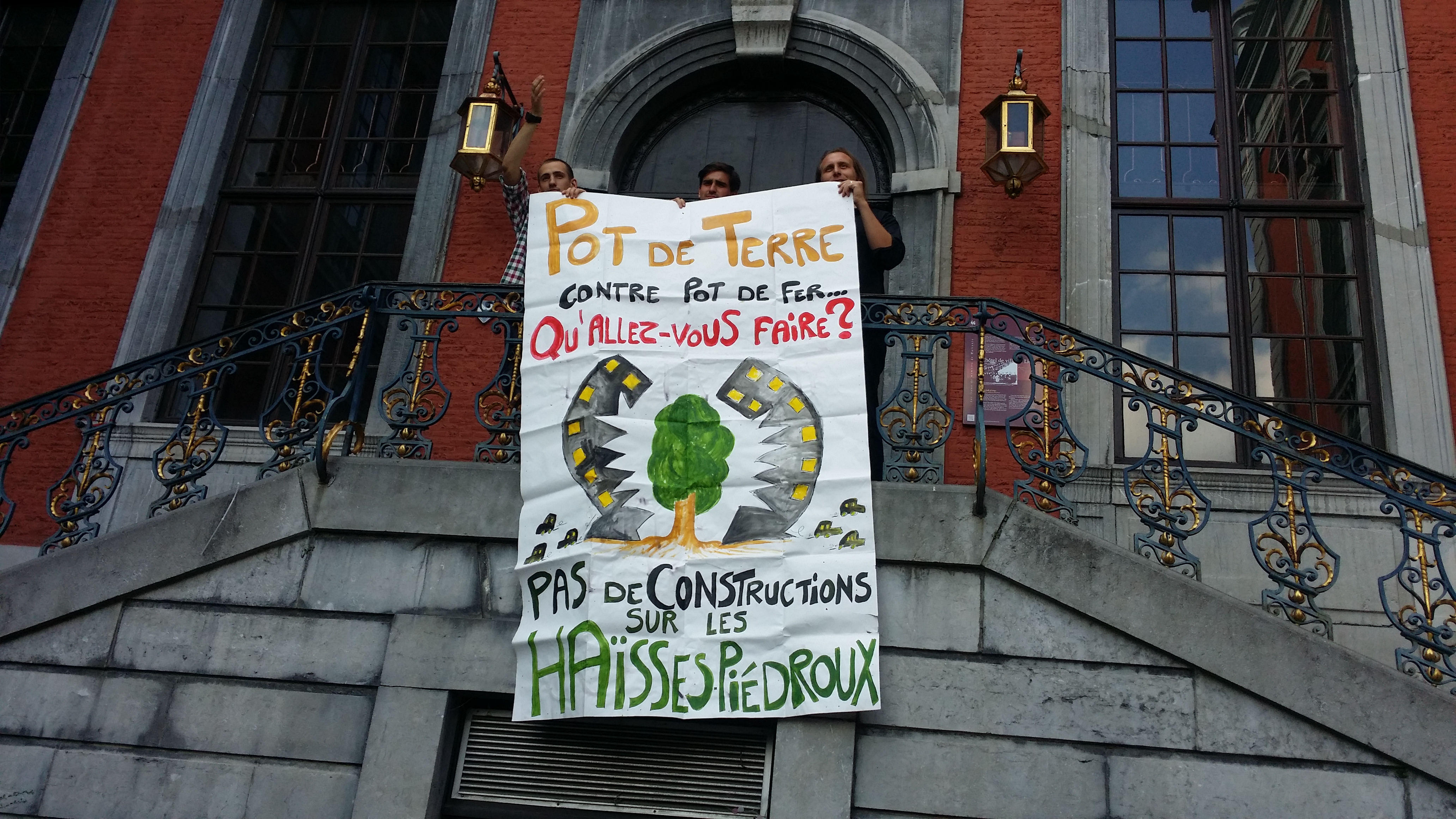 Le point d’orgue de notre campagne nous est offert par le calendrier, deux jours avant la fin de l’enquête publique. Le lundi 26 juin se tient en effet la dernière séance du Conseil communal de Liège avant les vacances. Nous décidons de venir montrer à tous les conseillers communaux, aux échevins et au bourgmestre notre opposition résolue au projet Neufcour.
