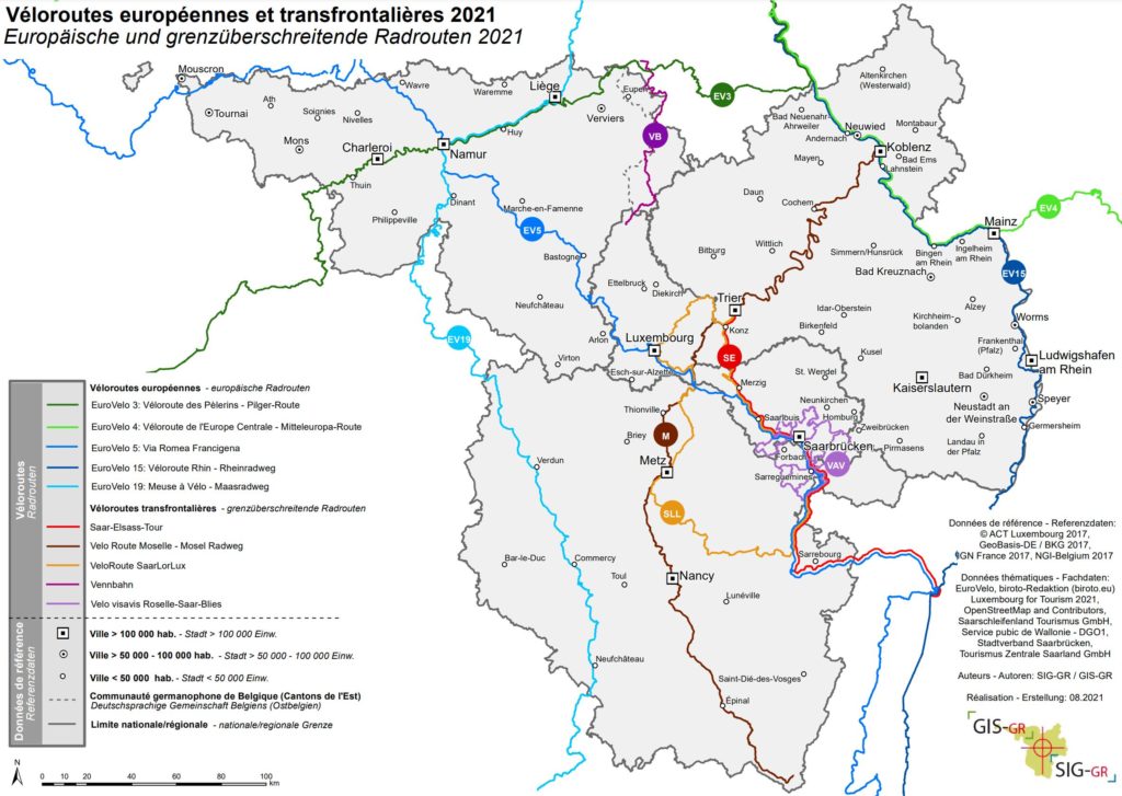A côté de ce logo régional figure le logo de l’itinéraire international en blanc sur fond de drapeau européen. En effet, le réseau RAVeL s’étend au-delà de nos frontières grâce à son intégration au sein des Véloroutes européennes.