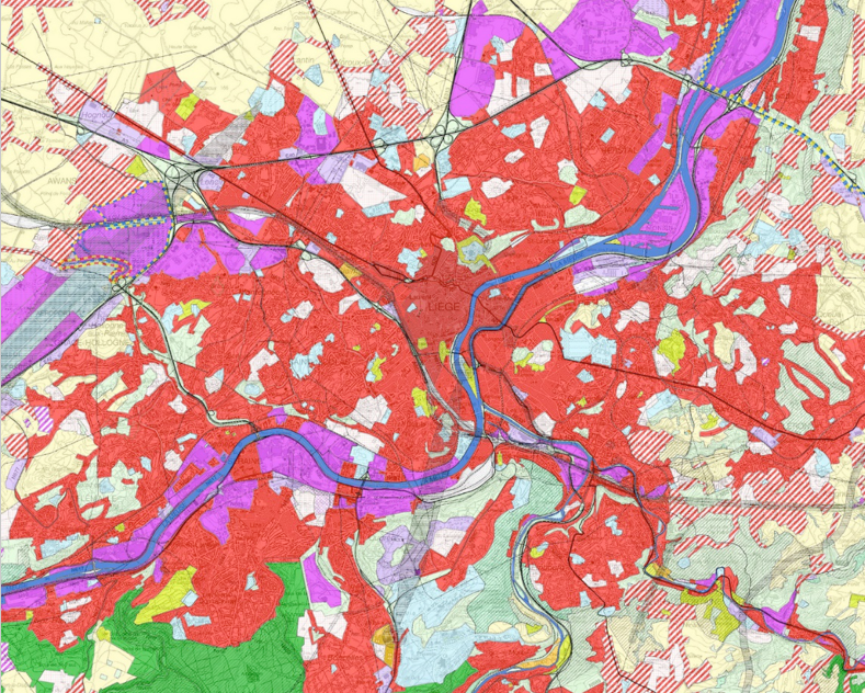 En effet, le Plan de Secteur « est divisé en zones destinées à l’urbanisation (zone d’habitat – en rouge – , de loisirs – en orange –, d’activité économique – en mauve –, etc.) et en zones non destinées à l’urbanisation (zones agricoles – en jaune –, forestières – en vert foncé –, espaces verts –en vert clair – , etc.). » [1]