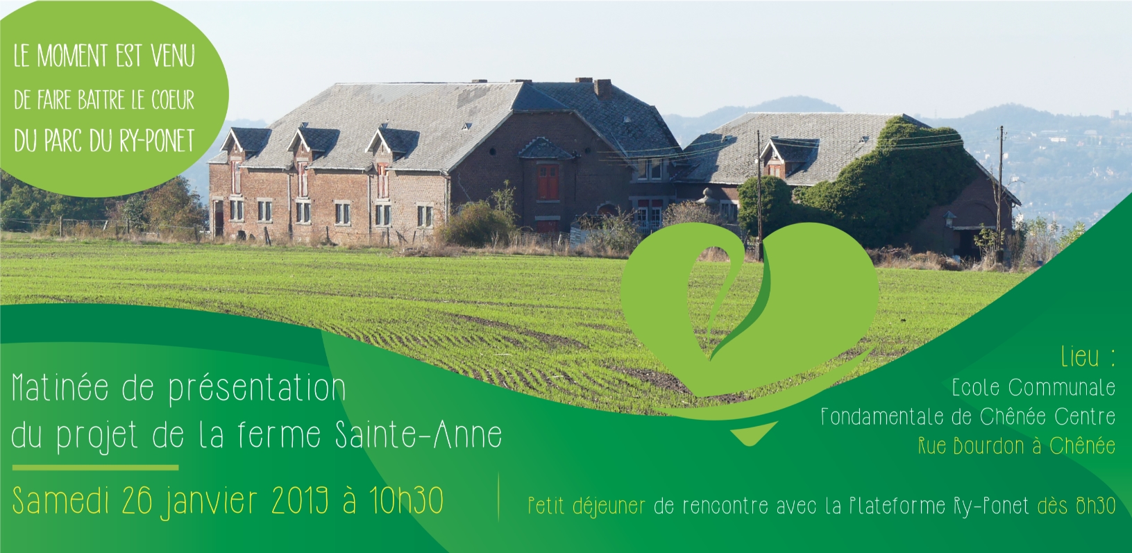 Après un petit déjeuner « produits locaux et solidaires » est venu le plat de consistance, à savoir la première présentation publique du projet de coopérative destiné à acquérir la Ferme Sainte-Anne, située à Beyne-Heusay en plein coeur du parc du Ry-Ponet, afin d’y lancer un projet de ferme pédagogique et de maraîchage bio.