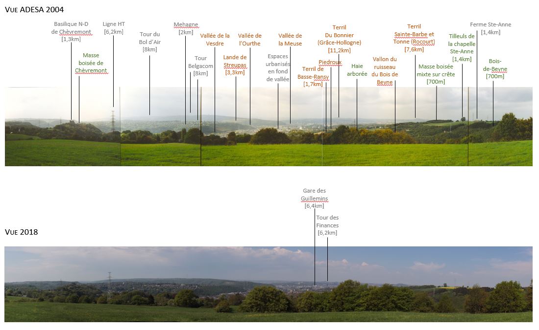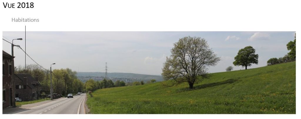 Dans son étude réalisée en 2004 à la demande de la Région Wallonne [1], ADESA a identifié un point de vue d’intérêt paysager [2] dans la prairie à la limite entre les deux communes [le PV 08] et un autre point de vue sur la rue Roosvelt [PV66].