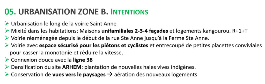 Depuis l’acquisition de ces terrains, la société La Planète Verte nv aurait étudié des projets d’urbanisation pour la rue Sainte-Anne, Chat Pirard et la Ferme Sainte-Anne mais nous n’avons pas de renseignements précis à ce sujet.