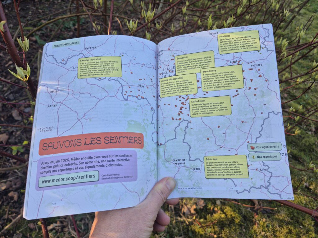 Médor, média belge indépendant d’enquête et de récits, a initié fin 2025 une enquête participative sur l’entrave au passage le long des chemins de Belgique, invitant les citoyens à signaler tout obstacle sur leur carte interactive.