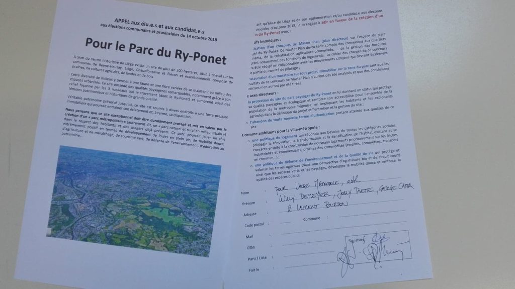 Lorsque commence la pré-campagne électorale au printemps 2018, le monde politique liégeois est devenu sensible à l’idée du parc du Ry-Ponet … mais la superficie et les limites du parc n’étant pas clairement établies et le contenu du projet restant peu détaillé, le soutien annoncé, particulièrement auprès des partis au pouvoir (ou aspirant à y arriver), reste essentiellement sur papier et ne se traduit pas en actes.