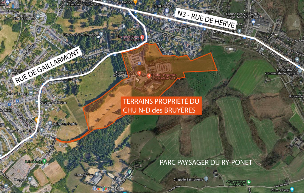 Le complexe du CHU Bruyères se situe en bordure du parc du Ry-Ponet, un vaste ensemble d’espaces verts et de terres agricoles qui s’étend sur plus de 400 hectares à cheval sur Liège, Beyne-Heusay, Chaudfontaine et Fléron et qui est reconnu pour la qualité de ses paysages.