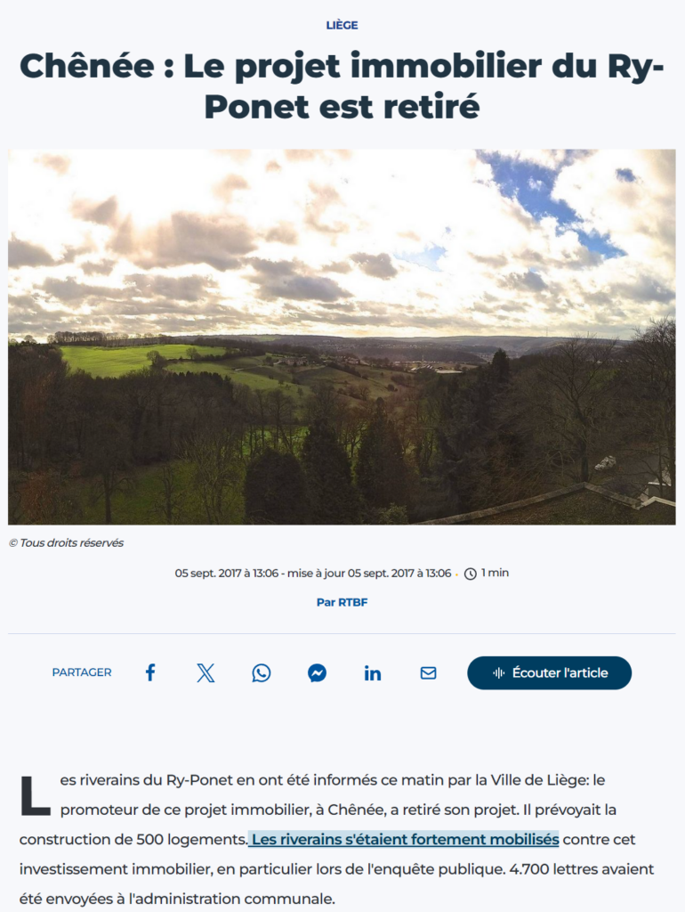 Publié le 5 septembre 201711 mai 2024 par S.Chênée : le projet immobilier du Ry-Ponet est retiré – RTBF.be Cliquez sur l’image pour accéder à l’article entier