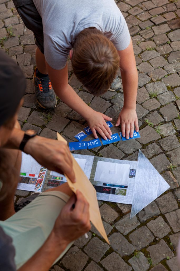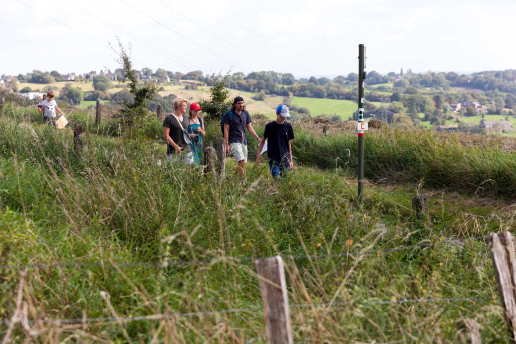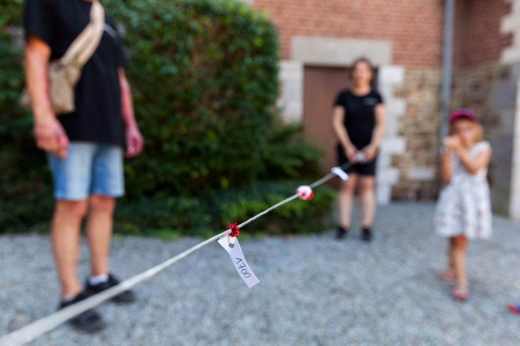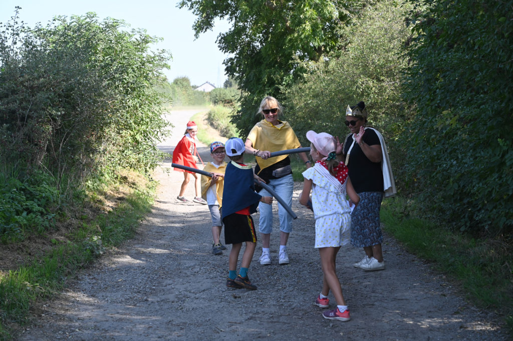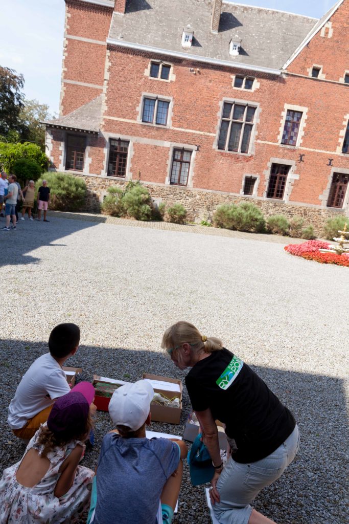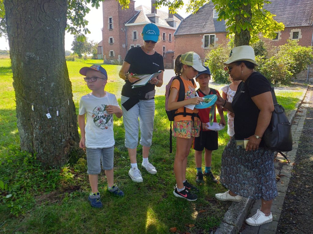 Jamais très loin de leurs parents, les plus jeunes ont bénéficié d’activités spécifiques. Au Central Téléphonique Fortifié, ils se sont incarnés en soldat des forts alentours et ont appris l’utilité de cet étrange petit bâtiment. Au château de Neufcour, ils sont partis à la recherche du pigeonnier, ont examiné les différents matériaux de construction des façades, leur origine et leur localisation dans la construction. Ils ont également réalisé que le château était vieux… très vieux grâce à un véritable fil du temps. Ils ont aussi observé les ancres, leur utilité et leur forme. Sur le chemin vers la chapelle Sainte-Anne ils ont participé à un rallye photos. A la chapelle, ils ont participé à la reconstitution de la Révolution liégeoise et ont compris le sens de ce monument et des 5 tilleuls qui l’entouraient. De retour à la guinguette, les enfants étaient récompensés avec de délicieux biscuits… bretons. Ils ont également pu laisser leur trace dans un arbre à messages.