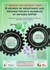 Un mois plus tard, c’est cette fois à Bruxelles que nous avons participé à une autre rencontre sur un thème proche. Organisée à l’initiative du mouvement politique des objecteurs de croissance (mpOC) et du magazine Kairos, avec le soutien du Réseau de soutien à l’agriculture paysanne (RéSAP) et des Acteurs des Temps présents, les « 8 Heures de Résistance aux Grands Projets Nuisibles et Imposés » ont réuni une trentaine d’associations et de mouvements.