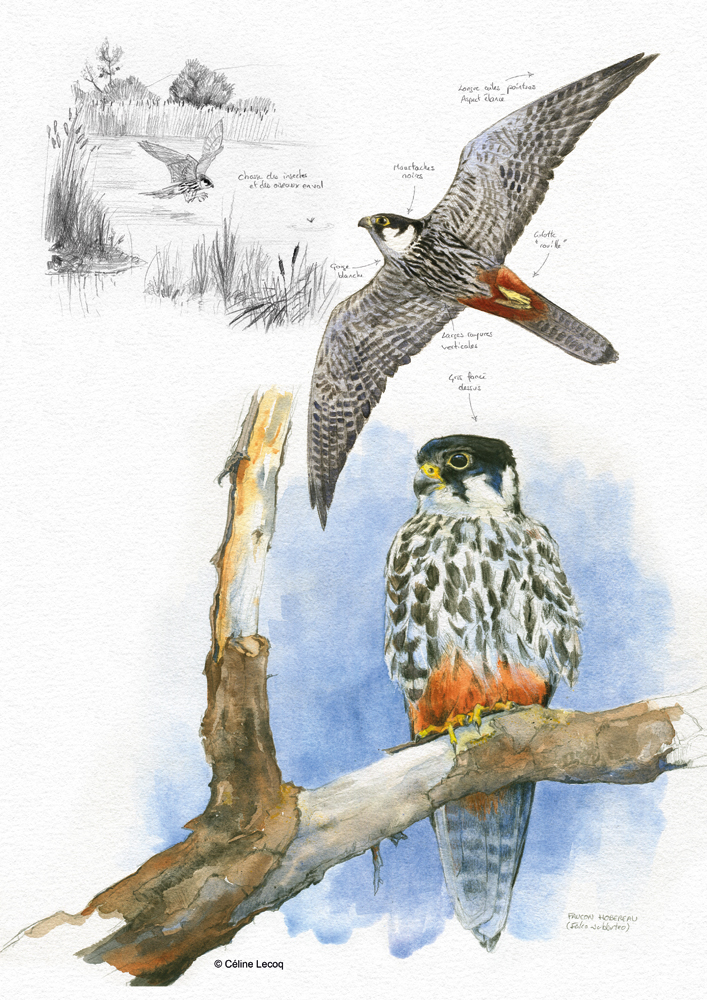 Grâce à la la magnifique page dessinée par Céline Lecoq dans le livre « Rapaces pyrénéens » écrit par Joël Duvernay aux éditions Corbac, nous pouvons identifier ce qui caractérise le faucon hobereau :