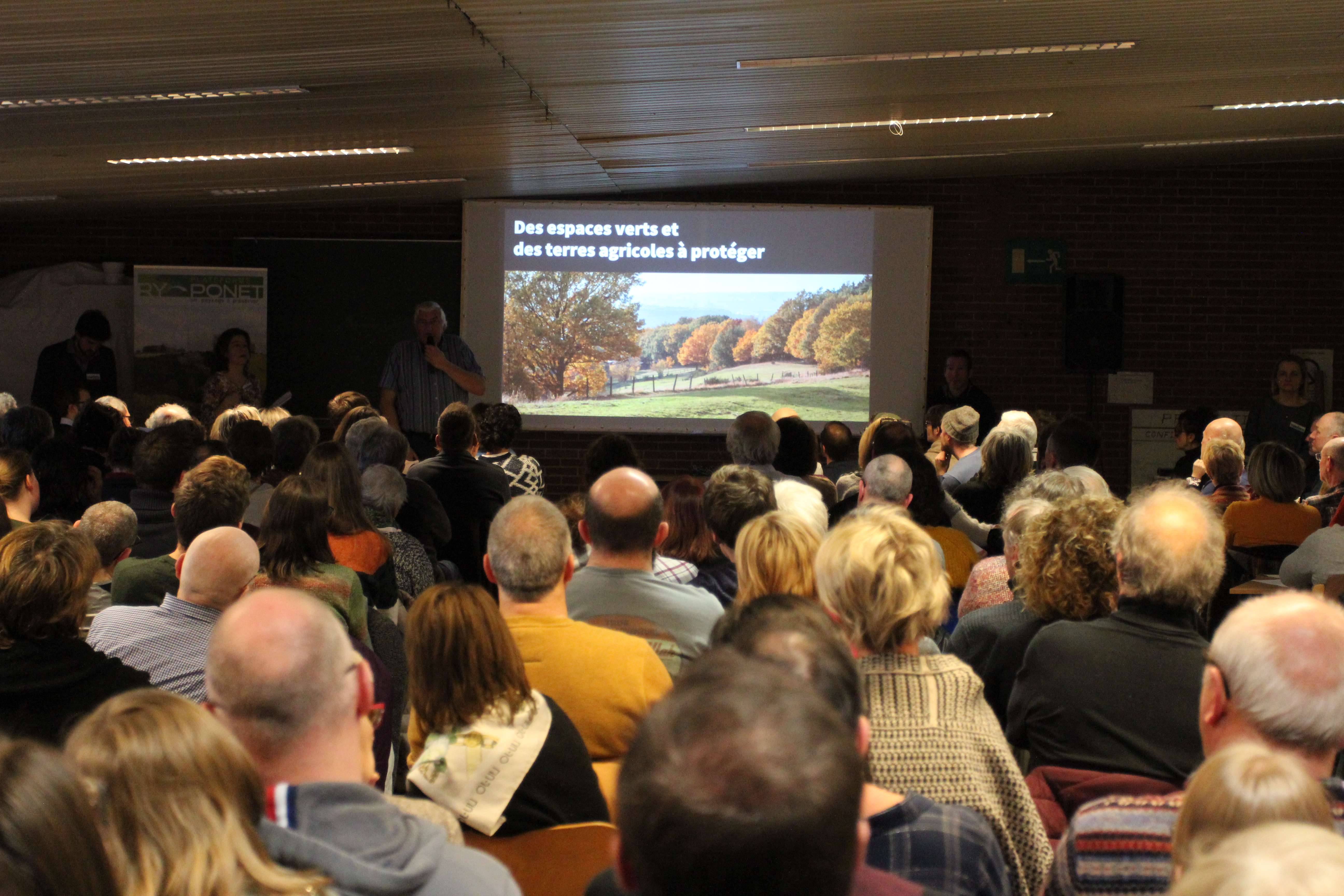 Pendant une heure, les responsables de la plateforme se sont succédés avec entrain au micro pour rappeler les grands traits du projet de parc du Ry-Ponet avant de présenter en détail et en images les atouts de cette ferme, les nombreux projets que nous souhaiterions y développer et les détails du processus de création de la future coopérative.