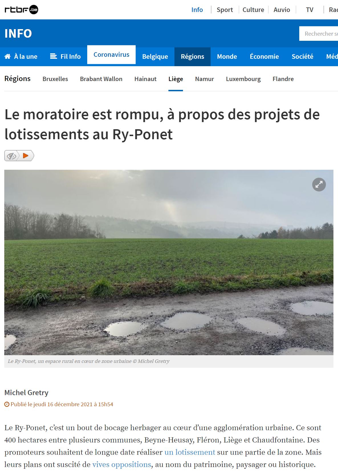 Le moratoire est rompu, à propos des projets de lotissements au Ry-Ponet – RTBF.be – Michel Gretry
