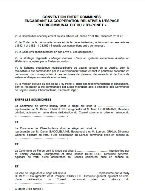 Le texte de la convention mentionne que les 4 communes « souhaitent continuer à travailler ensemble […] à la préservation de ce site d’exception et symbolique […] » et que « cette coopération a pour objectif principal de préserver l’espace pluricommunal dit du ‘Ry-Ponet’ de la pression foncière, en valorisant son caractère paysager et agricole […] ».