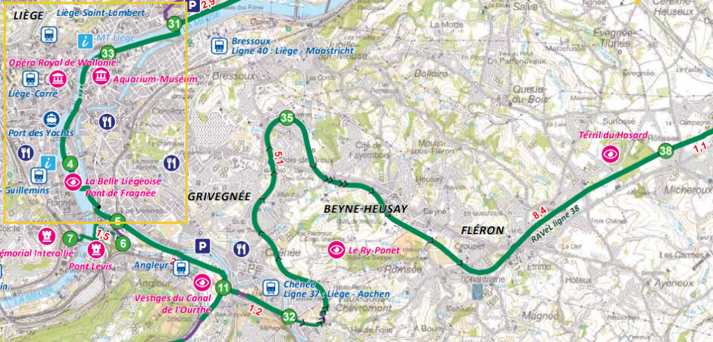 Le RAVeL des Lignes 38 et 39, une des plus anciennes et mythiques sections du RAVeL, relie Liège au lieu-dit des Trois Frontières, sur les hauteurs d’Aachen, en 55 km. Il constitue aujourd’hui un corridor vert sécurisé dans un milieu urbain dense dans sa première partie, puis qui traverse tout le Pays de Herve et ses bocages, en offrant un véritable exemple d’infrastructure durable de promenade utile dans le cadre des loisirs et activités touristiques. Mais il permet aussi à tout type d’usagers et par tout temps de se déplacer au quotidien vers le travail, les écoles, les commerces, la gare de Chênée…