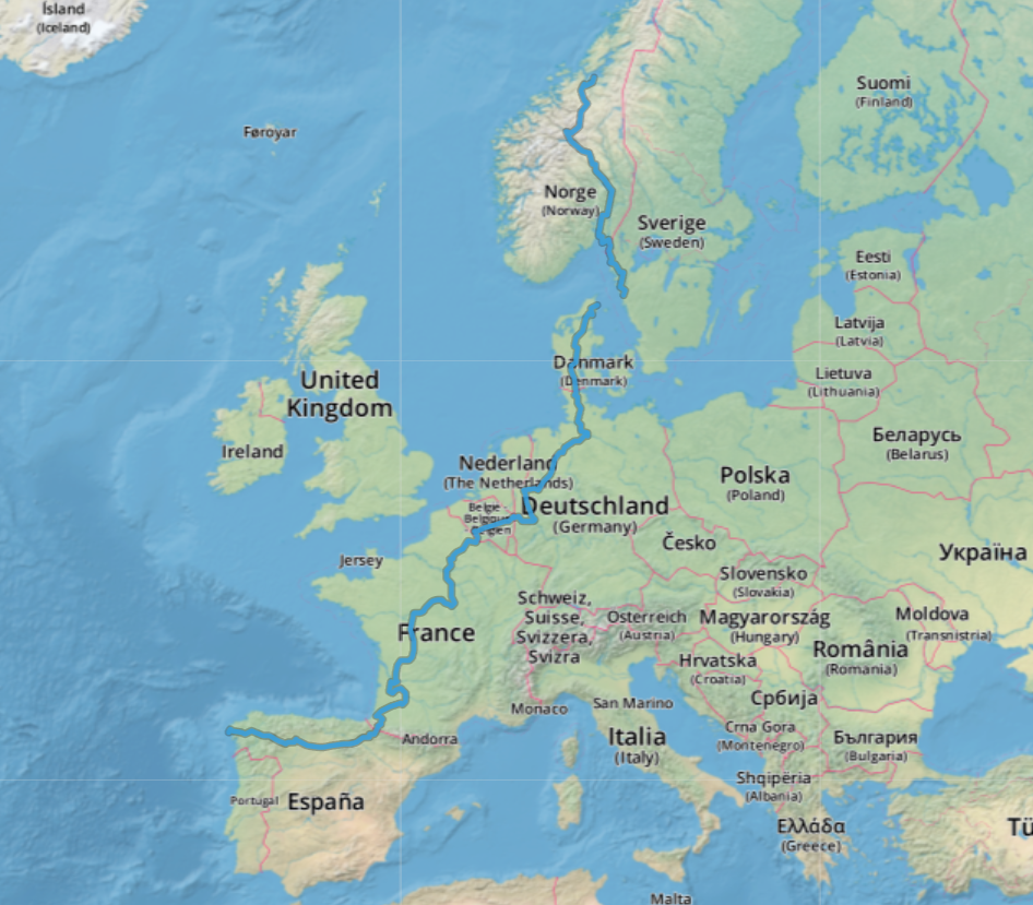L’EuroVelo 3 est un parcours de 5.600 km qui va de Trondheim en Norvège à Saint-Jacques-de-Compostelle en Espagne, en empruntant quelques-unes des plus célèbres routes de pèlerinage européennes jalonnées de quelques-uns des édifices religieux les plus impressionnants du continent, dont les cathédrales de Cologne, Aix-la-Chapelle et Saint-Jacques de Compostelle. L’itinéraire se termine au cap Finisterre, considéré comme la fin du monde connu pendant de nombreux siècles.