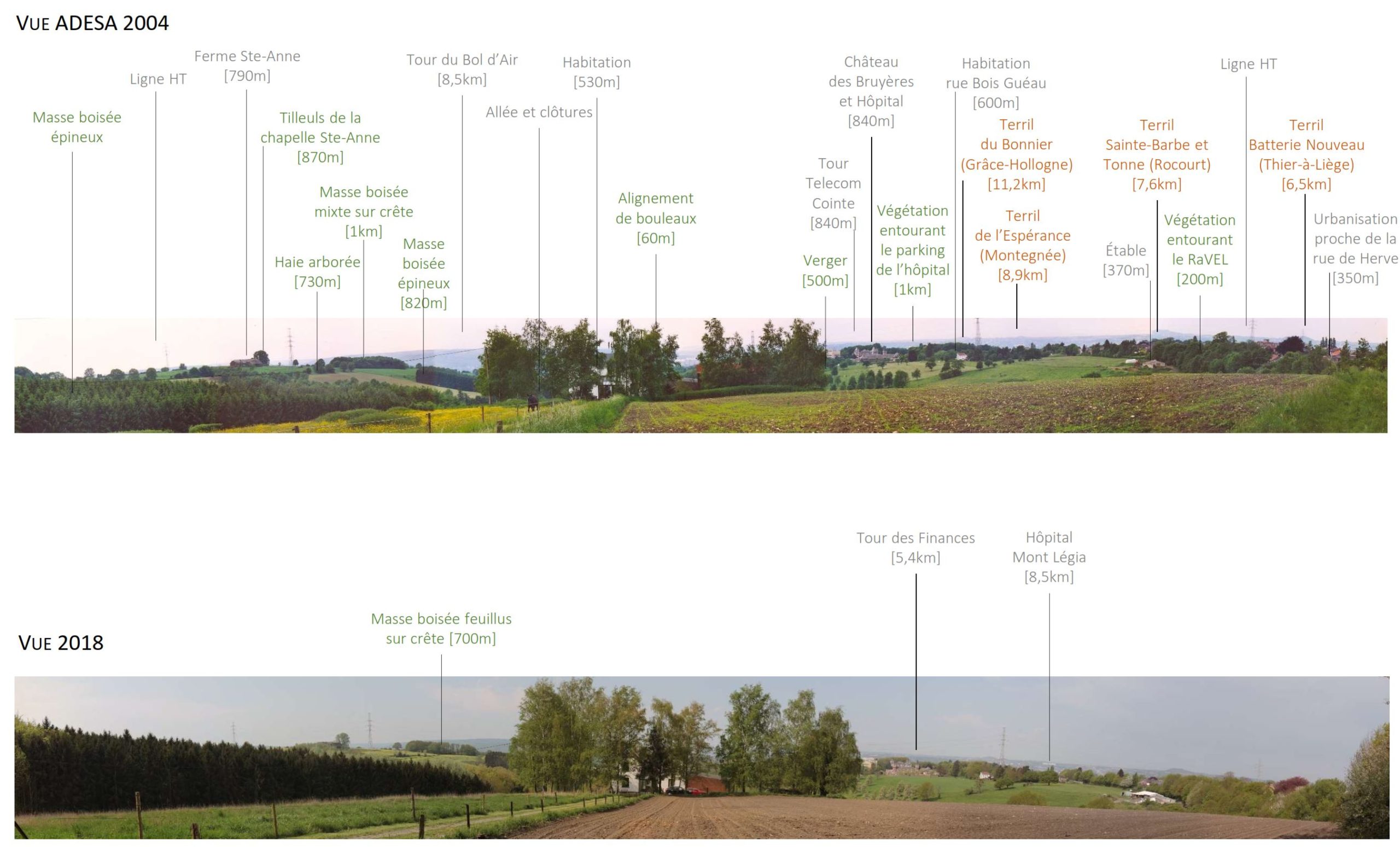 Depuis les terres agricoles mais aussi depuis le RAVeL qui les longe, on bénéficie d’une vue incroyable sur tous les environs. C’est un des seuls points de vue qui permette de percevoir le vallon du Ry-Ponet et en arrière-plan les vallées de la Meuse et de l’Ourthe. Le paysage est absolument magnifique.