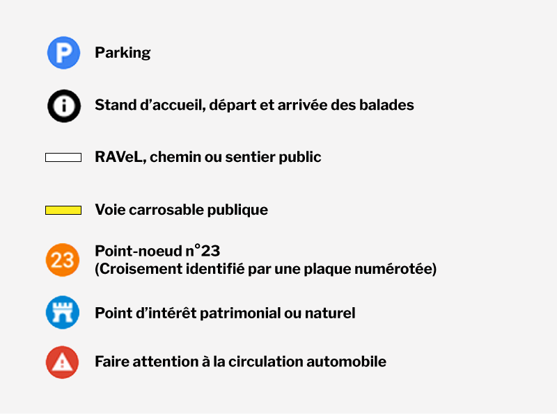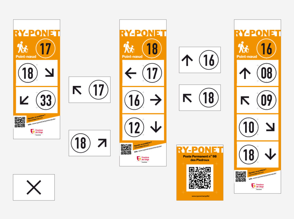Voici les balises points-noeuds, balises intermédiaires et plaques d’identification que vous suivrez sur le terrain.