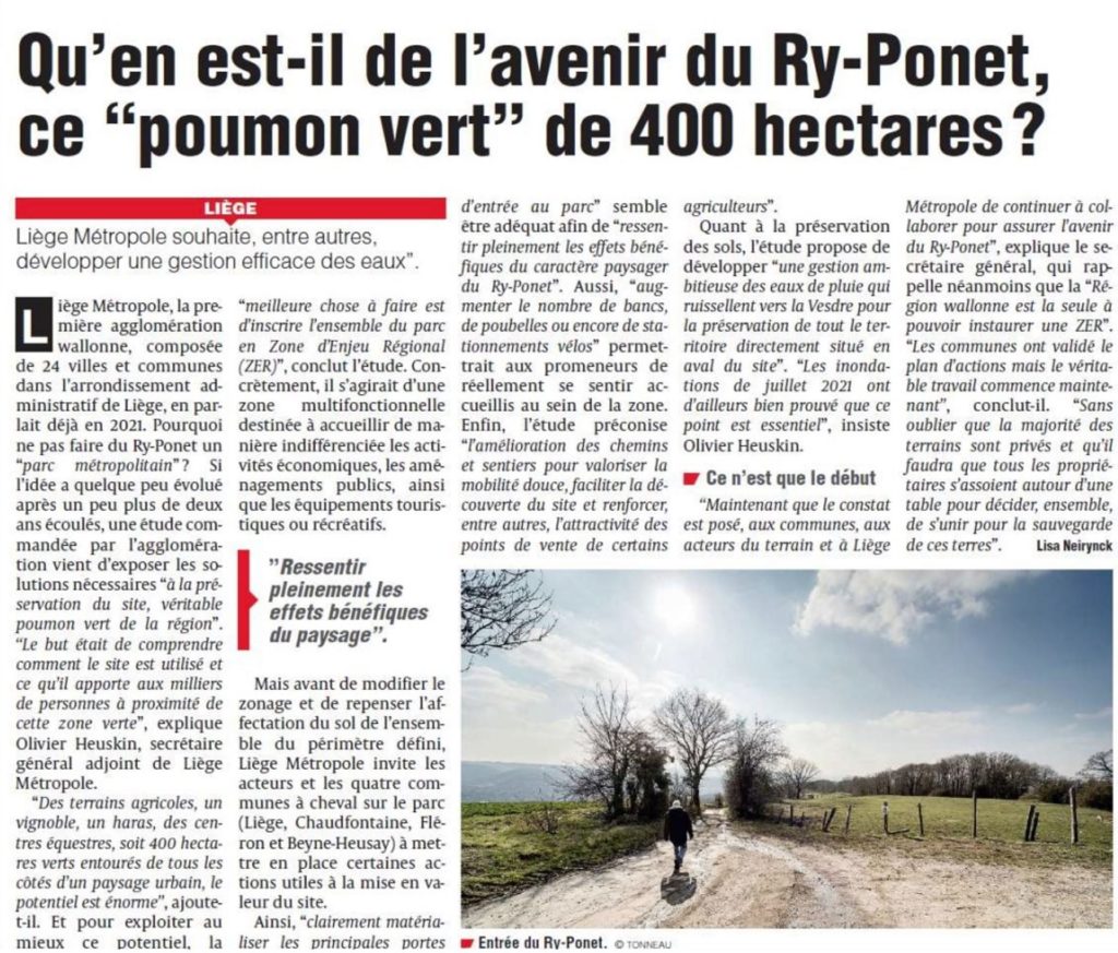 Publié le 16 novembre 202316 novembre 2023 par S.Qu’en est-il de l’avenir du Ry-Ponet, ce « poumon vert » de 400 hectares ? La Dernière Heure, Lisa Neirynck. Cliquez pour agrandir.