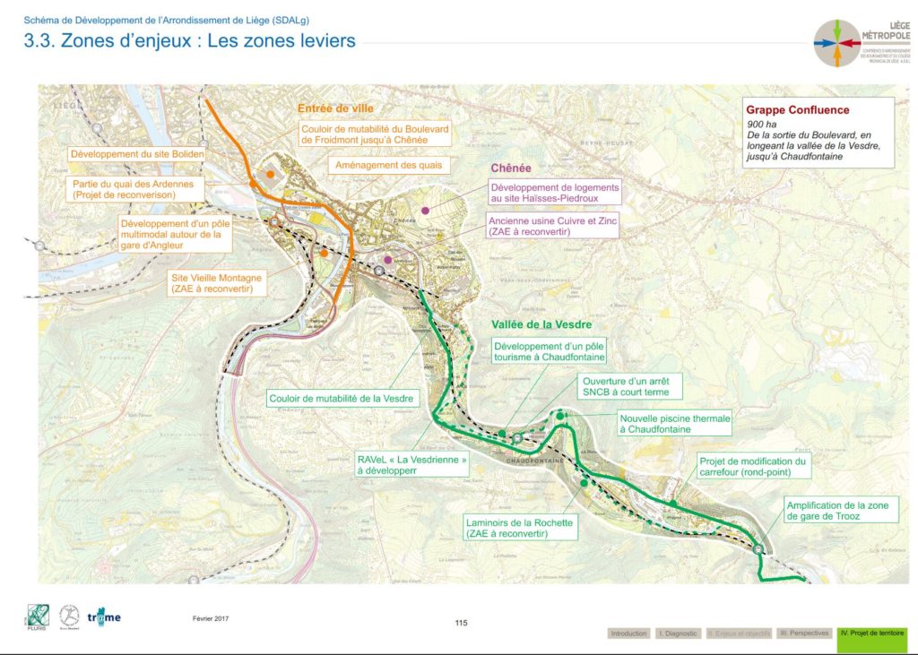 Dans le cadre des « zones d’enjeu », et plus particulièrement des « zones leviers », le Schéma identifie une zone particulière (la grappe « Confluence ») qui s’étend au long de la vallée de la Vesdre de Liège (Angleur et Chênée) jusqu’à Chaudfontaine. Et, dans cette zone, il inclut, le projet immobilier de la société Neufcour avec ses 520 logements ! (page 115 du rapport final du SDALg).